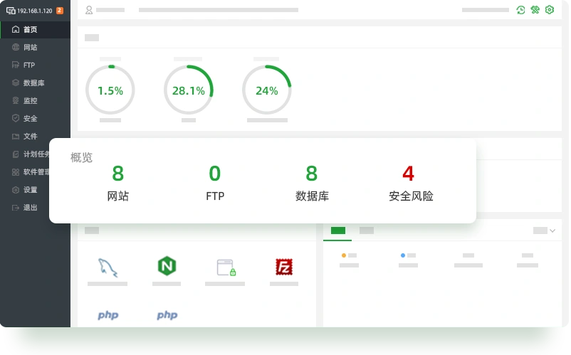 一键管理网站、数据库、FTP、文件、SSL、计划任务等
